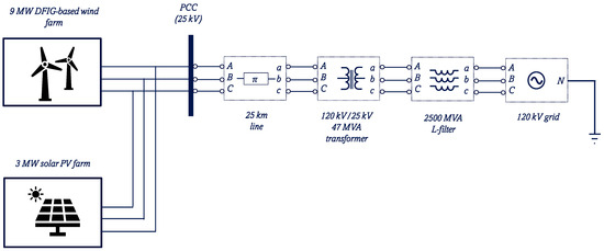 When severe disturbances occur in the system, the crowbar protection circuit often triggers, shorting the rotor circuit, causing the generator to absorb reactive power from the system, further depressing the voltage at the point of common connection (PCC) and delaying post-fault voltage recovery [30,31,32]. Thus, fast external reactive power support at the PCC is required at the PCC to satisfy LVRT requirements in weak or disturbed grids. One device that belongs to the family of FACTS, i.e., the static synchronous compensator (STATCOM), has been proposed for reactive power injection to improve the FRT capability of the DFIG-WECS [39,46,47].