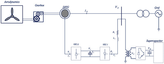 Disturbance occurring anywhere in the power system, even far away, could be felt at the point of DFIG connection, causing voltage variations [28,29]. Because of the direct connection of the DFIG’s stator to the grid, the DFIG is vulnerable to disturbances [30,31,32]. Any voltage sag or phase jump immediately propagates to the stator flux. If a sudden reduction in stator voltage occurs, the machine is demagnetised, with a large transient electromotive force (EMF) (proportional to , i.e., the rate of change in stator flux) induced in the rotor, demanding high rotor current. The RSC and GSC are current-limited, in the order of 1.2–1.5 , and the DC-link may experience overvoltage during extreme faults.