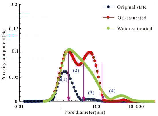 First, low-temperature N2 adsorption at 77K was conducted to obtain the specific surface area and pore size distribution of the samples. Using a Micromeritics ASAP 2460 surface area and porosity analyzer, powdered samples (20–35 mesh) degassed under vacuum were analyzed over a relative pressure (P/P0) range of 0.01–0.995 to record adsorption/desorption isotherms. BET theory was applied to calculate specific surface area, and the BJH method was used to derive mesopore (2–50 nm) size distribution [29,30,31,32,33]. For micropores (<2 nm), complementary CO2 adsorption at 273 K was performed, and the Dubinin–Radushkevich (D–R) model was used to estimate micropore surface area and volume. Second, NMR T2 spectrum analysis on core plugs, combined with capillary pressure imbibition and drainage experiments, was carried out to evaluate pore connectivity and the lower limit of effective pore size. Dried core samples were sequentially saturated with simulated formation fluids (brine and crude oil), and then T2 relaxation spectra were measured. By comparing T2 spectra under water-saturated vs. oil-saturated conditions, oil-wet (primarily organic pore) versus water-wet (inorganic pore) pore fractions were identified, and their proportions calculated by formula (Figure 3). Finally, combining NMR with nitrogen adsorption results, a joint inversion method was applied to extend the quantitative pore size characterization of the T2 spectrum, yielding a continuous pore-size distribution curve over a wide range (0.001–100 μm) [34]. This continuous distribution was used to compare pore size characteristics across different stratigraphic intervals.