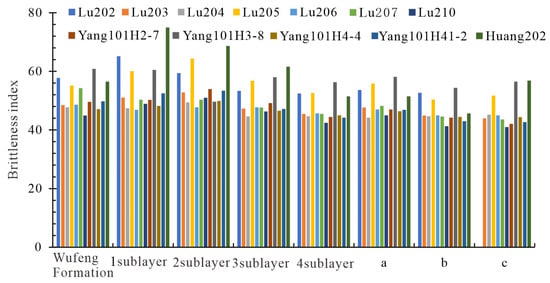 Shale brittleness influences the formation of hydraulic fracture networks and is a key parameter indicating the ease of reservoir stimulation [35,36,37,38,39]. The mineral brittleness index calculated from XRD mineralogy shows that the WF and Long11-1–3 sublayers have brittleness indices of 50–65%, clearly higher than the Long11-4 sublayer’s 35–50%. On average, the Long11-1 sublayer in each well has >50% brittleness index and Long11-2 and Long11-3 are about 50–60%, whereas Long11-4 segments a and b are only 40–55%, and segment c is the lowest, under 40% (Figure 6). Vertically, brittleness decreases upward, consistent with decreasing quartz and increasing clay content. Spatially, the Lu203 area has slightly higher brittleness than the Yang101 area, because the former’s shales contain slightly more carbonates and pyrite and less clay; the Yang101 area’s higher clay content lowers its brittleness. Compared to shallow Huangguashan shales (>60% brittleness index), the deep shales in the study area are overall less brittle (Figure 6). Lower brittleness implies more difficulty in fracturing stimulation—higher pumping pressures and more proppant would be required to effectively stimulate the reservoir.