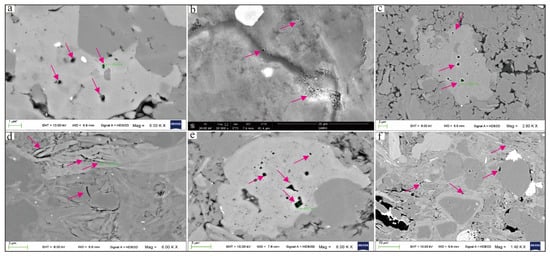 Inorganic pore development in different sublayers of the study area. (a) Lu205, 4035.43 m; (b) Yang101H3-8, 3787.57 m; (c) Yang101H3-8, 3782.95 m; (d) Yang101H2-7, 4145.92 m; (e) Lu205, 4024.62 m; (f) Lu205, 3983.1 m.