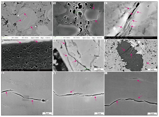 By genesis, reservoir pore space in the shales can be categorized into three main types: organic pores, inorganic pores, and microfractures. Inorganic pores are further subdivided into interparticle pores and intraparticle pores [40,41,42,43]. Direct SEM observation reveals significant differences in pore structure between different stratigraphic layers.
