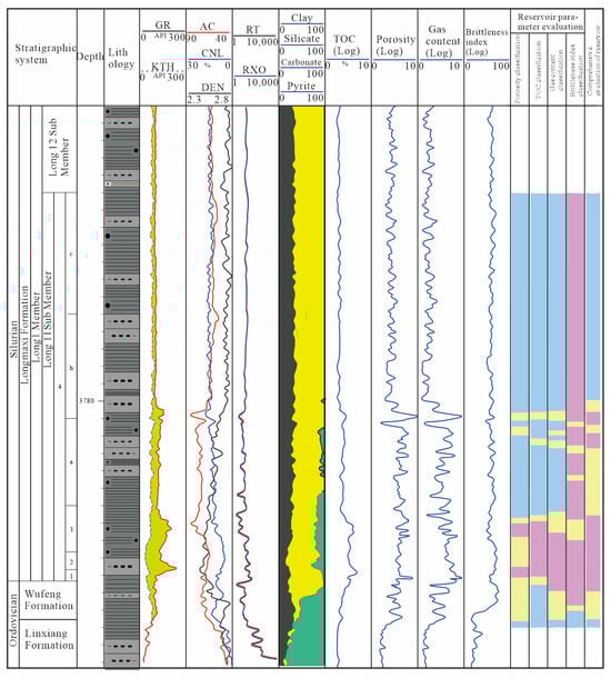 The study area is located in the southern part of the Luzhou low-fold belt. Compared with the extensively developed shale gas blocks such as Fuling and Weiyuan, it is characterized by greater burial depths (generally >3700 m) and higher formation pressures, with pressure coefficients ranging from 1.8 to 2.3. Previous studies have mainly focused on shale gas reservoirs of the Longmaxi Formation at burial depths shallower than 3500 m. In contrast, this study provides a comparative investigation of shale reservoir characteristics under deep-burial conditions, highlighting differences associated with greater burial depth. The target interval in this study includes the WF Formation and the lower part of the LMX Formation (Long 11 sub-member). The Long 11 sub-member is subdivided into four sublayers (numbered 1, 2, 3, and 4 from bottom to top), and the fourth sublayer is further divided into three segments (a, b, c). Core, well log, and fossil evidence allow identification of each sublayer’s depositional features: the Long11-1 sublayer is a thick, organic-rich black shale with high natural gamma (GR) readings and abundant graptolites; the Long11-2 sublayer is gray-black mud shale interbedded with silty bands, with moderate to lower GR; the Long11-3 sublayer is black shale alternating with thin silty shale, with second-highest GR; the Long11-4 sublayer is overall gray-black shale grading upward into turbiditic siltstone, with the lowest GR values, and at the base of segment “a”, a graptolite zone is visible that diminishes upward (Figure 2). The WF shale thickness is generally 10–20 m, with high TOC and densely distributed graptolites. The total thickness of the Long 11 sub-member is 50–80 m. Sublayers 1–3 are organically rich and lithologically pure (high mud content), representing the main gas-generating intervals; sublayer 4 contains more silty interbeds and shows an upward transition toward a more proximal, shallower water facies [24,25,26]. Long11-1 to Long11-3 sublayers are characterized by high organic-matter content and a homogeneous mudstone lithofacies (indicating high clay content). In the study area, the latest Silurian Hanjiadian Formation is absent, and the Permian Liangshan Formation lies directly and unconformably on the LMX Formation, indicating that after the Late Silurian, the area underwent structural uplift and erosion.