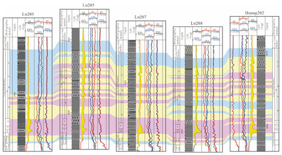 Correlation of comprehensive reservoir evaluation across wells Lu203, Lu205, Lu207, Lu208, and Huang202.