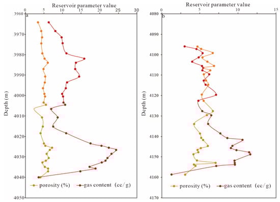 Proportion of pore types in shallow- vs. deep-shale reservoirs. (a) Wei204 well, 3525.81 m (shallow-shale pore characteristics); (b) Yang101H2-7 well, 4145.92 m (deep-shale pore characteristics).