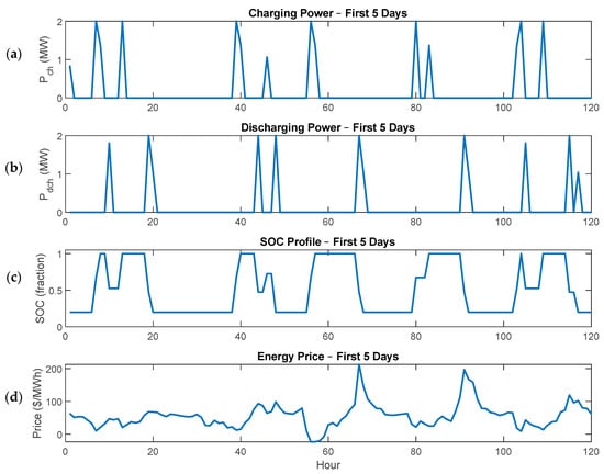 Five-day dispatch overview showing (a) battery charging power Pch, (b) discharging power Pdch, (c) state of charge (SOC) as a fraction of total capacity, and (d) corresponding energy price (AUD/MWh).