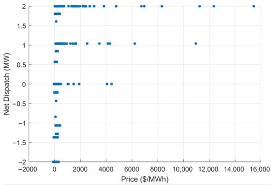 Figure 3 illustrates the relationship between market price and the net dispatch of the community battery. A distinct price-responsive behaviour is observed. When prices are low or close to zero, the battery shows a strong charging response (negative net dispatch), indicating that the MILP controller exploits low-price periods to store energy. As prices increase to moderate levels, dispatch transitions toward zero, signalling periods where the battery holds energy to preserve headroom for future high-price events or FCAS commitments. At very high prices—particularly during extreme price spikes (>AUD 5000/MWh)—the battery consistently discharges at or near its maximum power rating. This demonstrates the optimization framework’s ability to capture high-value arbitrage opportunities. The concentration of points at the charge and discharge limits also confirms that the battery cycles strategically rather than continuously, preserving SOC for high-value intervals. Overall, the pattern validates the expected economic behaviour: charge during low-price periods, discharge extensively during price spikes, and remain neutral during moderate-price conditions.