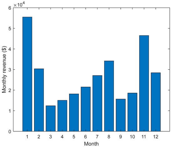 Figure 6 presents the monthly revenue distribution of the 2 MW/4 MWh community battery over the simulation year. The results show pronounced seasonal and temporal variability in revenue, reflecting changes in wholesale electricity prices, FCAS availability, and network support opportunities across months. Higher revenues are observed in selected months (e.g., early and late in the year), which correspond to periods of increased price volatility and system stress, while lower revenues occur in months with flatter price profiles and reduced arbitrage margins. This variation highlights that battery profitability is not uniformly distributed over the year but is driven by a limited number of high-value operating periods. The figure underscores the importance of strategic dispatch and market participation, as a significant share of annual revenue is captured during months with favourable market conditions rather than through continuous operation.