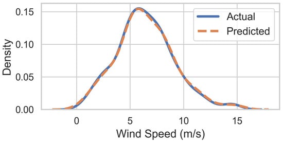Figure 7 illustrates the Kernel density estimates of the actual and predicted wind speed distributions which showed high overlap, affirming the model’s capability to replicate the statistical characteristics of the wind speed data.