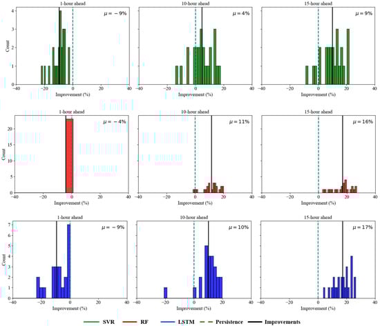 The results from Figure 8 provide useful insights of the predicting performance for each model (SVR, RF and LSTM) compared to the persistence baseline at 1, 10 and 15 h horizons. Overall, the distributions indicate that these short-term predictions pose a challenge: all three models show negative mean improvements at the 1 h horizon, indicating persistence is still very difficult to beat when the forecast window is very short [21]. However, as the time horizon is extended, the models start to benefit more clearly. For RF and LSTM, the improved positive means at both 10 and 15 h indicates that these learning-based approaches better capture broader temporal patterns which persistence accurately capture.