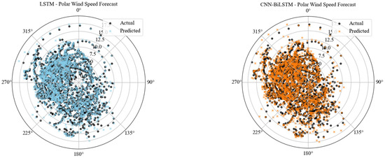 Figure 9 presents polar scatter plots of modelled and observed wind speeds for various directions of wind from each model. These plots show the quality with which each model explains the joint magnitude–direction aspect of wind behaviour within Bonavista’s coastal environment. In all models, the great majority of time series of wind events cluster in the southwest to northwest sectors (approximately 225° to 315°), consistent with Bonavista’s coastally dominated wind patterns. The CNN-BiLSTM and LSTM models are more highly predictive of actual wind observations over the prevailing directions. They possess predicted values closely clustered around actual values, indicating that they preserve well both wind speed magnitude and directional bias.