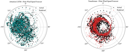 The Attention-LSTM model, while generally close agreement, possesses somewhat higher dispersal in predicted speeds between directions, particularly at 270°, indicating potential difficulties with higher-frequency directional change. On the contrary, the Transformer model has more extreme over-prediction for wind speeds, especially for events in the 180–270° range. This is evident from the spread of red predicted marks beyond the corresponding black actual values. While this model does follow the dominant directional trend, it appears to struggle more with magnitude accuracy in some regimes of winds.