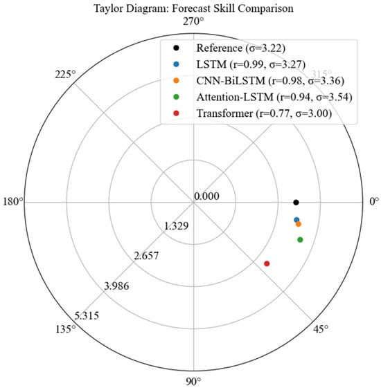 For comparison purposes, four models were implemented and trained with the same data used in this research: the baseline LSTM, a CNN-BiLSTM as in [22], an Attention-LSTM with bidirectional architecture [23], and a lightweight Transformer model [24]. The models were compared based on RMSE, MAE, MAPE, and R2 with their performances visually compared using two advanced visualization techniques: the polar wind forecast plot and the Taylor diagram.