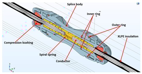 The structure of the reference cable splice, successfully developed and used for LV applications, is depicted in the 3D cross-section of Figure 1. The splice is composed of a splice body (housing), compression bushing, inner and outer rings, Cross-linked Polyethylene (XLPE) insulation, conductor and Melni’s Dual Helix Spiral Contact (spring) connecting two conductor parts. This structure makes easy assembling the splice in the field, minimizing man operation time and mistake risks.