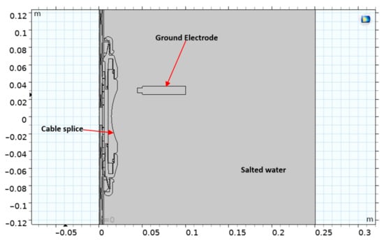 Electric field simulation was performed on the reference cable splice using COMSOL Multiphysics 6.3, at an applied voltage of 1 kV AC RMS, 60 Hz, using a configuration that fits the experimental setup for modeling validation (3rd leg, see later). The LV cable splice was positioned inside a plastic container (made from High Density Polyethylene, HDPE) filled with salted water. The dimensions of the container are 25 × 25 × 20 inches. Additionally, a ground electrode was submerged in salted water to establish a ground connection. Figure 2 shows the schematic of an LV cable splice design in 2D cross-section alongside the ground electrode placed in a salted-water plastic container. Table 1 reports LV cable splice components, material and relative permittivity used in the simulations. The salt water was considered a perfect conducting medium.