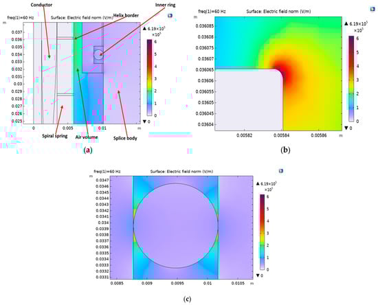 Electric field simulation in the reference LV splice 1 kV AC: (a) Picture showing electric field distribution at the spring helix border and around the inner ring. (b) Zoomed view showing electric field concentration at the helix border (edge), Ep = 0.62 kV/mm. (c) Zoomed view showing electric field concentration due to the air gap around the inner ring, Ep = 0.24 kV/mm.