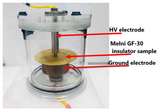 Based on the experimental results obtained, rising voltage with a rate of 10 kV/min, which causes breakdown in a few minutes, which is a typical type in breakdown strength tests [23], and the cell with cylindrical electrodes of Figure 4 (with flat specimens as test object, immersed in insulation oil), the mean value of breakdown voltage, BV, was 21 kV, corresponding to an electric field strength of 30.8 kV/mm (under the assumption of uniform field at the breakdown location and mean insulation thickness 0.68 mm).