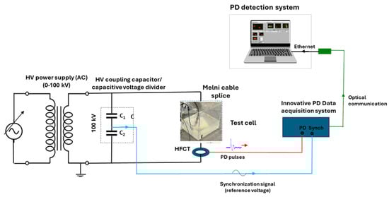 Prior to carrying out PDIV tests on cable splices, the experimental setup of Figure 6 was tested and ensured that it was PD-free. The PDIV was estimated as the mean value of at least five measurements carried out according to the IEC 60270 standard. The test voltage gradually increased (at a step of 100 V) until PD signals were observed steadily.