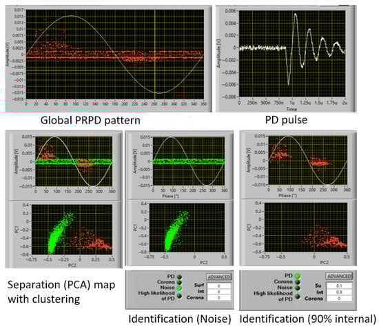 To acquire and analyze the PD activity, an innovative, fully automatic PD detector was used. PD measurements were processed by algorithms that are structured according to the SRI (Separation, Recognition, Identification) logic. Separation of PD from noise is accomplished by procedures that cluster acquired signals by signal processing using principal component analysis (PCA) [26]. Recognition of whether a separated cluster consists of PD or noise is based on signal processing and statistical tests performed on signal characteristics, recognizing those related to noise or PD. Separation and Recognition allow sub-patterns to be obtained from the general acquisition patterns, which contain PD (sometimes due to different types of sources) and noise, separately. PD sub-patterns are the basis for enabling the Identification of the type of source generating PD, a fundamental tool for diagnostics and condition assessment of electrical power equipment. Various markers are considered by a fuzzy-logic-based approach [26,27], according to which PD can be primarily identified as belonging to three categories, i.e., the internal, surface, and/or corona discharges.
