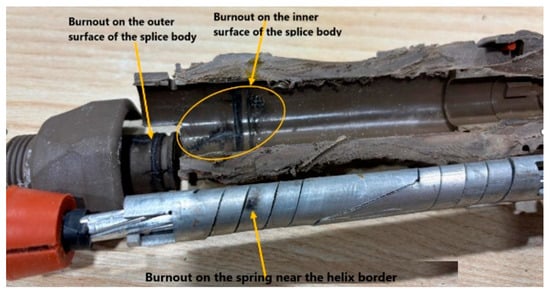 Breakdown traces on the cable splice sample after accelerated aging test where burnouts are shown on some splice components, such as on the inner and outer surface of the splice body, and on the surface of the helical spiral aluminum spring (helix border). They constitute an indication of PD activity location and development inside the cable splice.