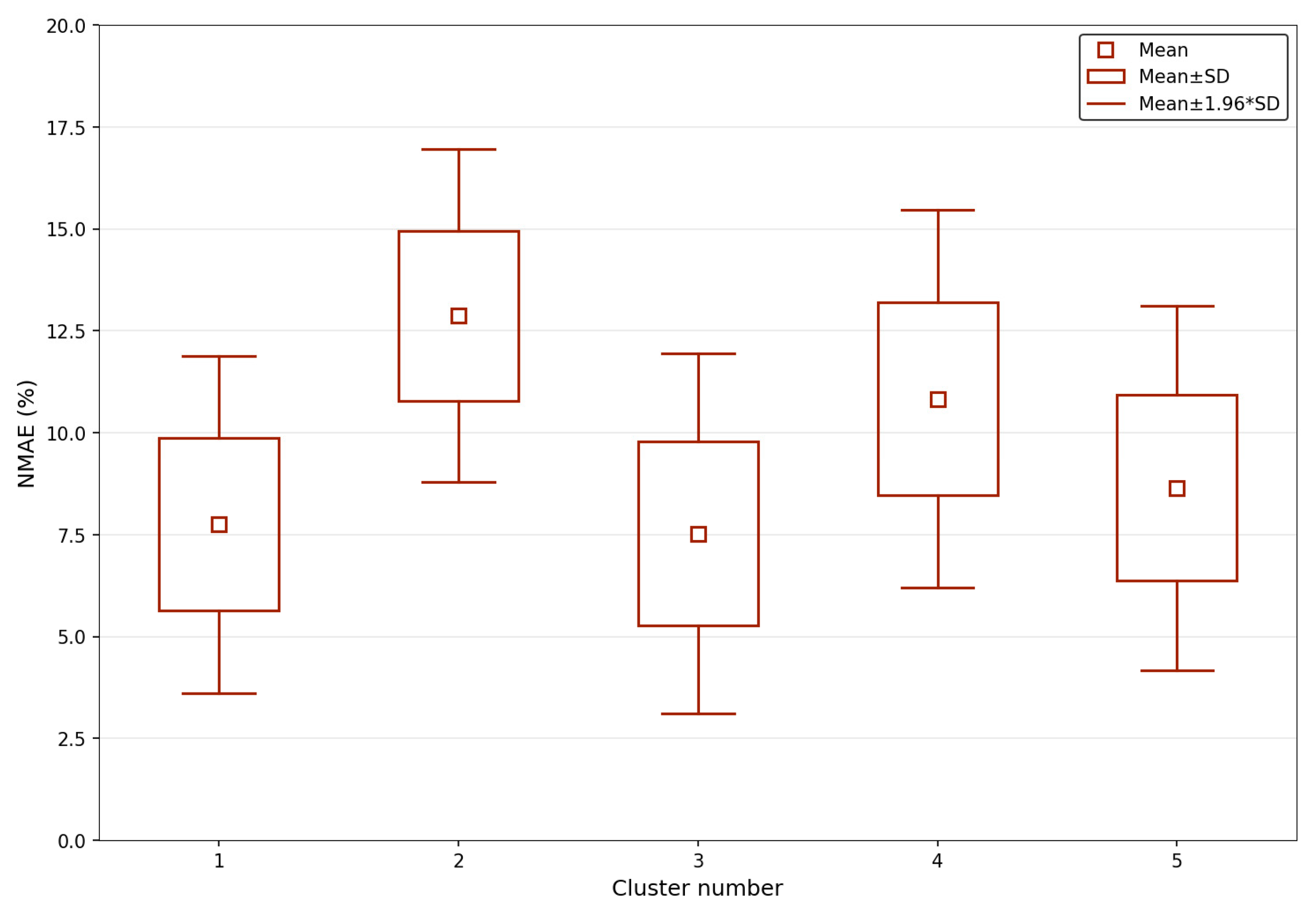 | Cluster | Most Frequently Selected Model | Mean NMAE, % | |||||||