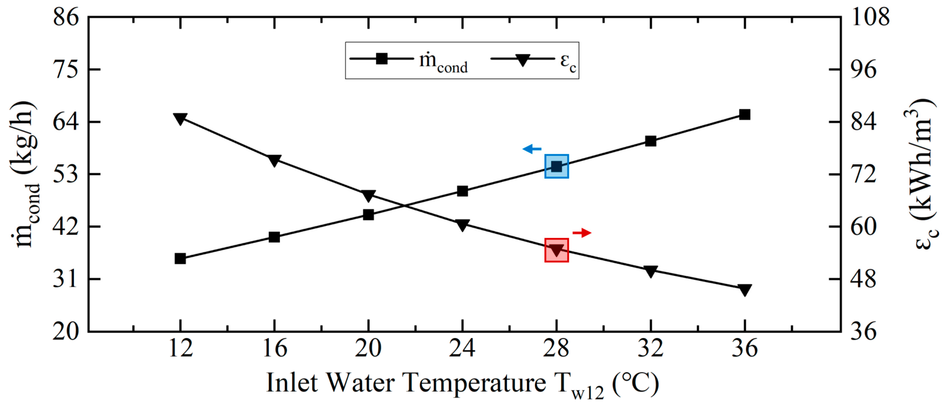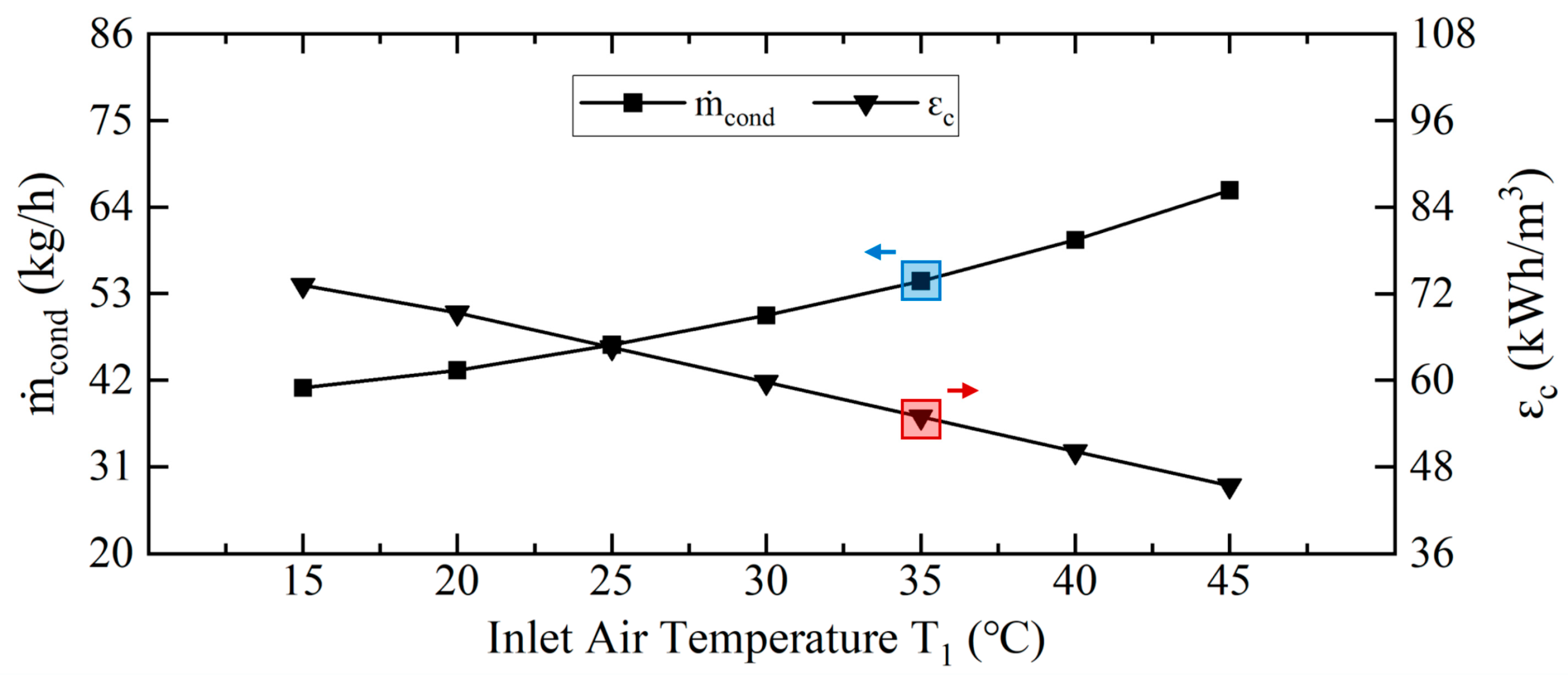 - The increase in the inlet water temperature can enhance heat transfer, reduce the air temperature drop, and increase the moisture content of the air inside the DEU, resulting in the water yield increasing by up to 1.8 times and the energy rate decreasing by up to 46%, while the increase in the inlet water flow rate has less of an impact on the performance of the system and can only slightly increase the water output.