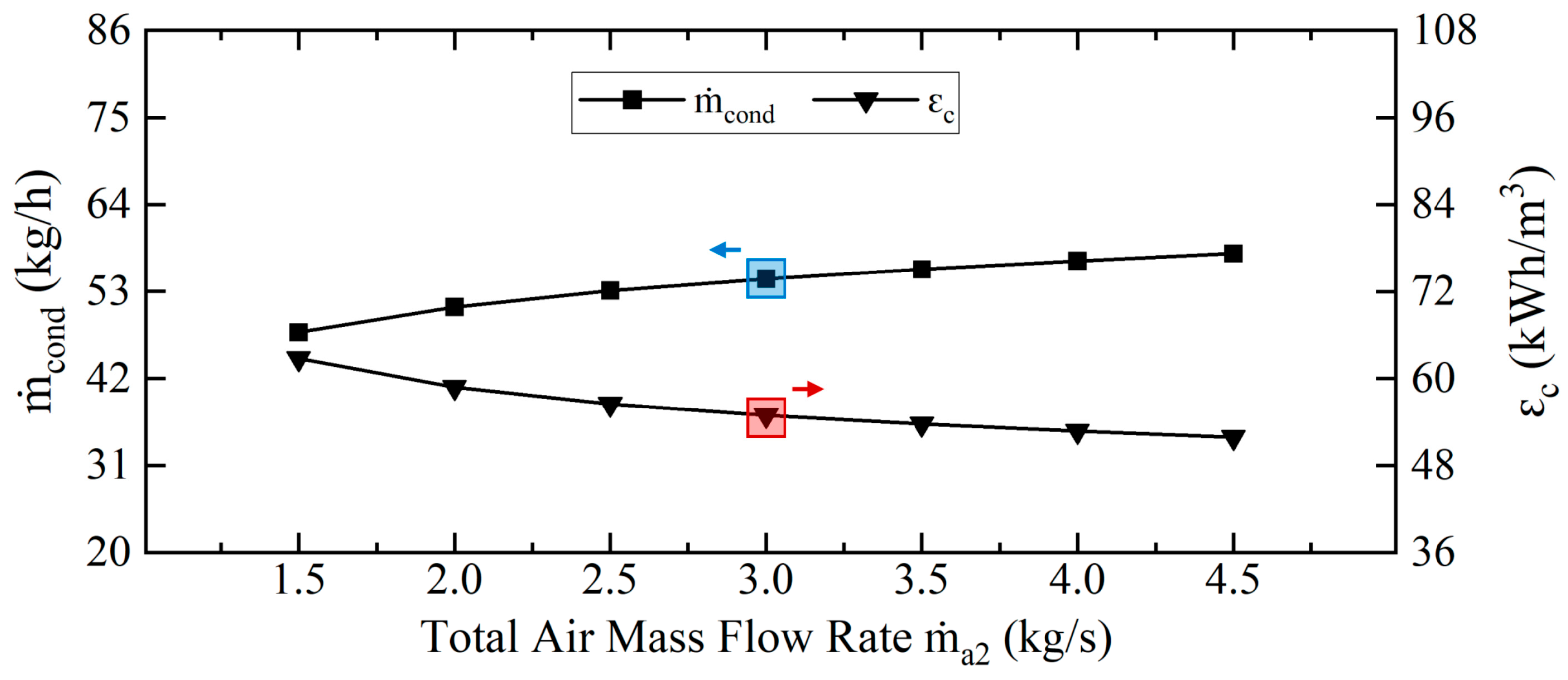 - Increasing the total air mass circulated through the system can improve the performance of the system, with water yield increasing by up to 21% and energy rate decreasing by up to 38%.