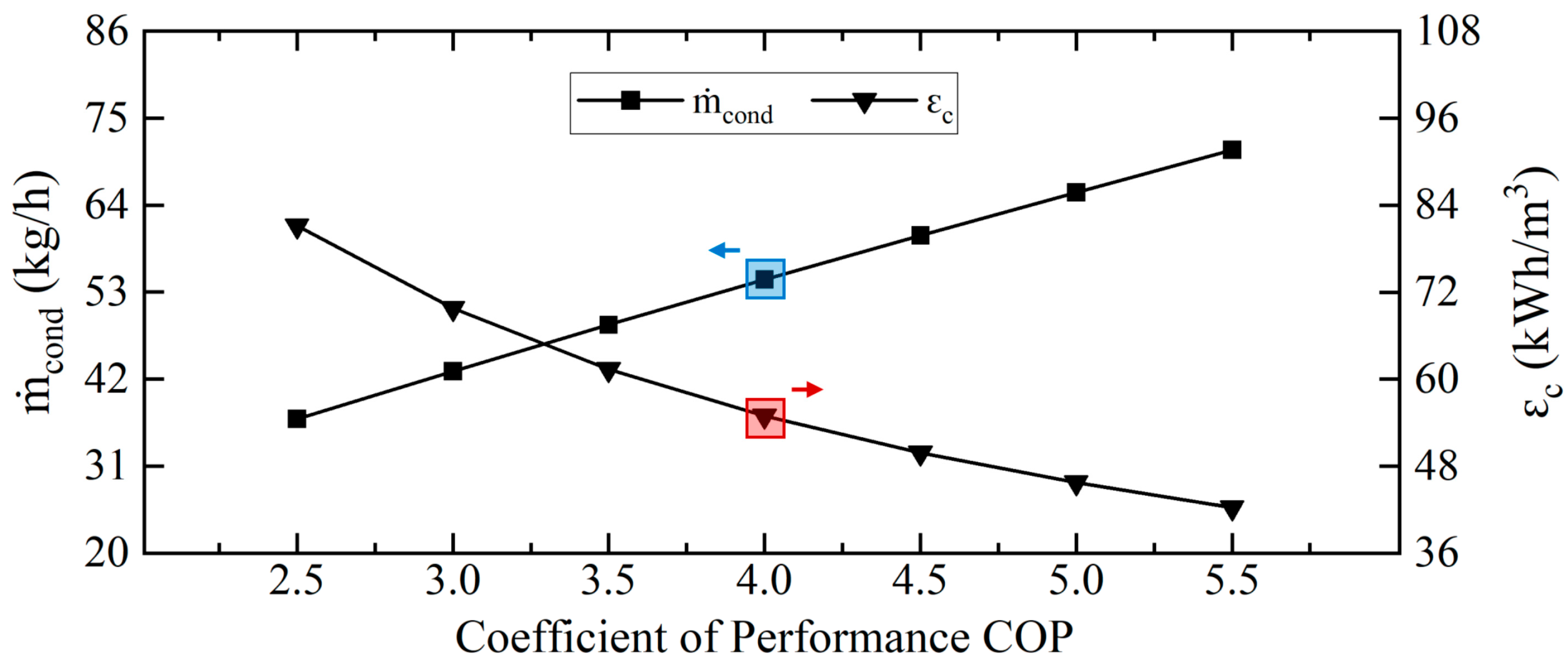 - Increasing the compressor power or system COP can effectively increase the total water yield. An improvement in COP can enhance the efficiency of the VRU and enhance the condensation potential, with water yield increasing by up to 1.9 times and energy consumption per unit of freshwater reduced by up to 48%.