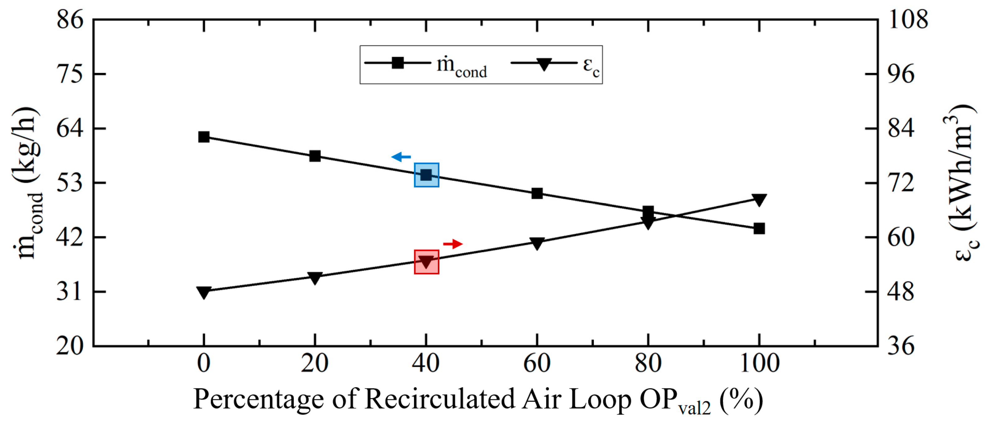 - An improvement in DEU performance, i.e., an increase in the relative humidity at the outlet of the DEU, would improve the system performance effectively. In other words, the design, the structure, and the operation of the DEU are key to system performance, with water yield increasing twofold and energy rate decreasing by up to 51%.