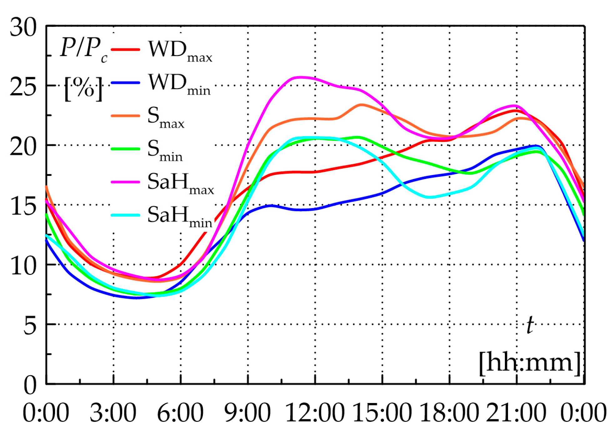 - Variant I—No photovoltaic installations in the estate, minimum and maximum power consumption by consumers.