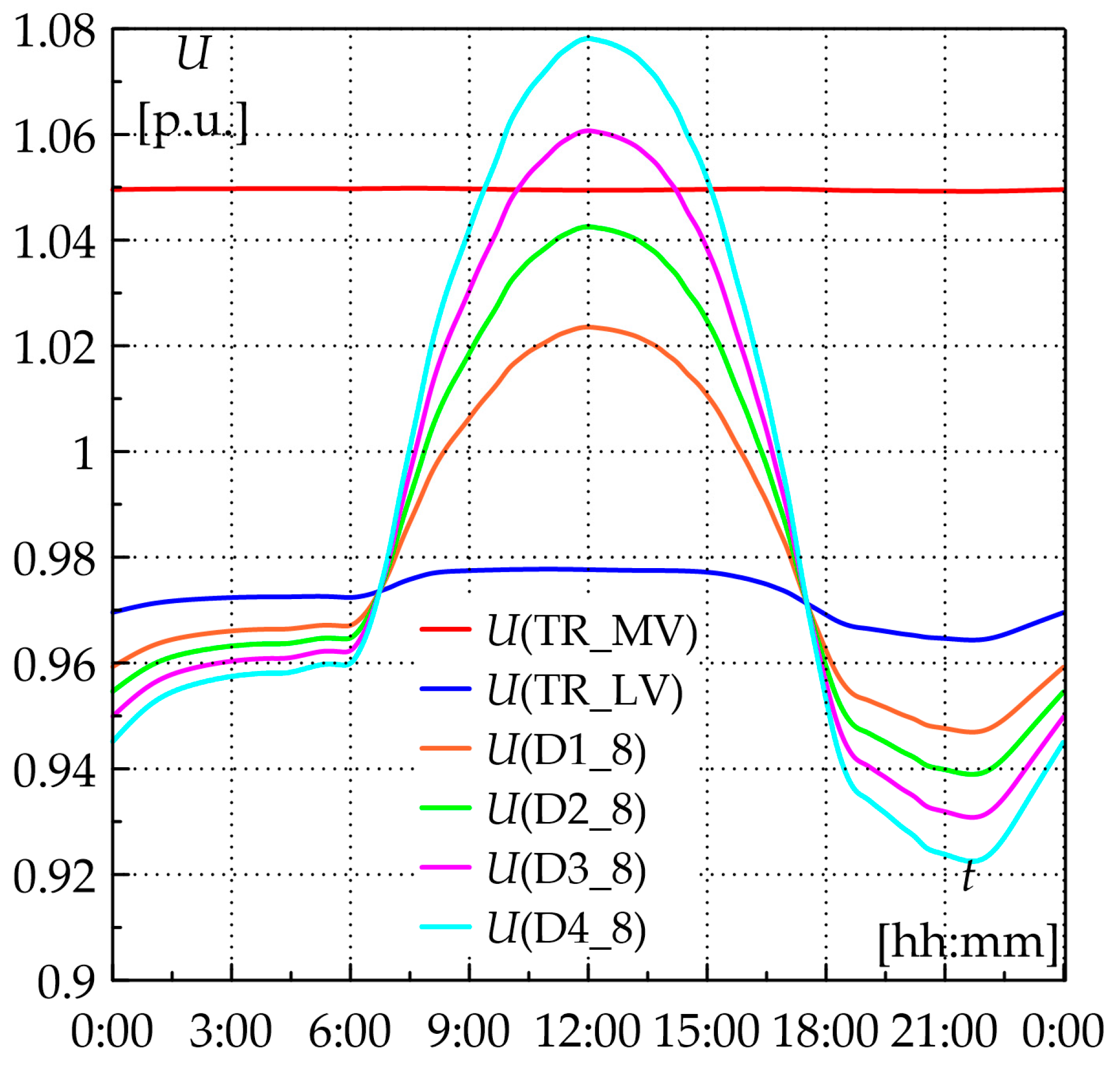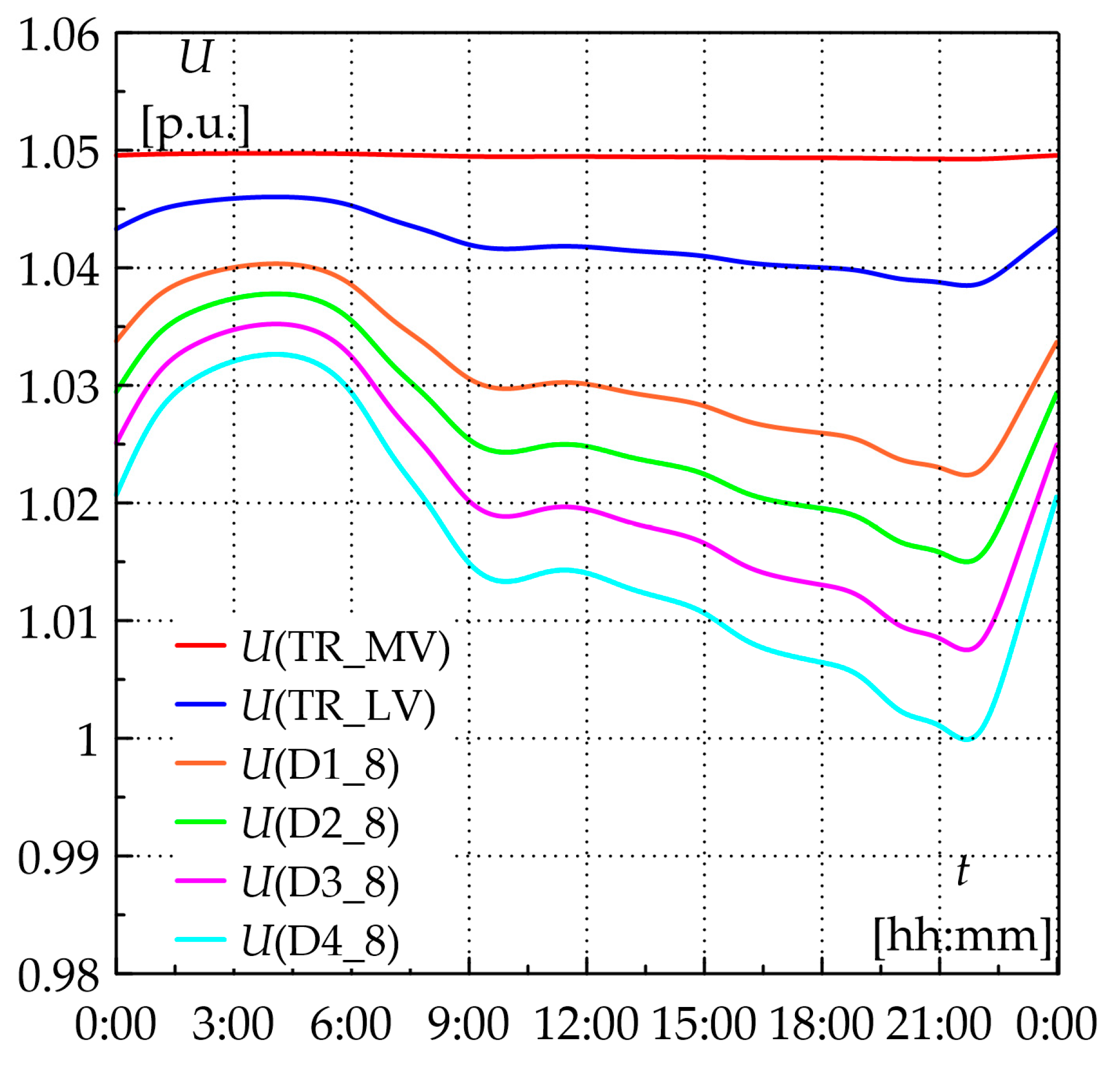 - Umin—the minimum voltage value occurring in the network nodes during the day.