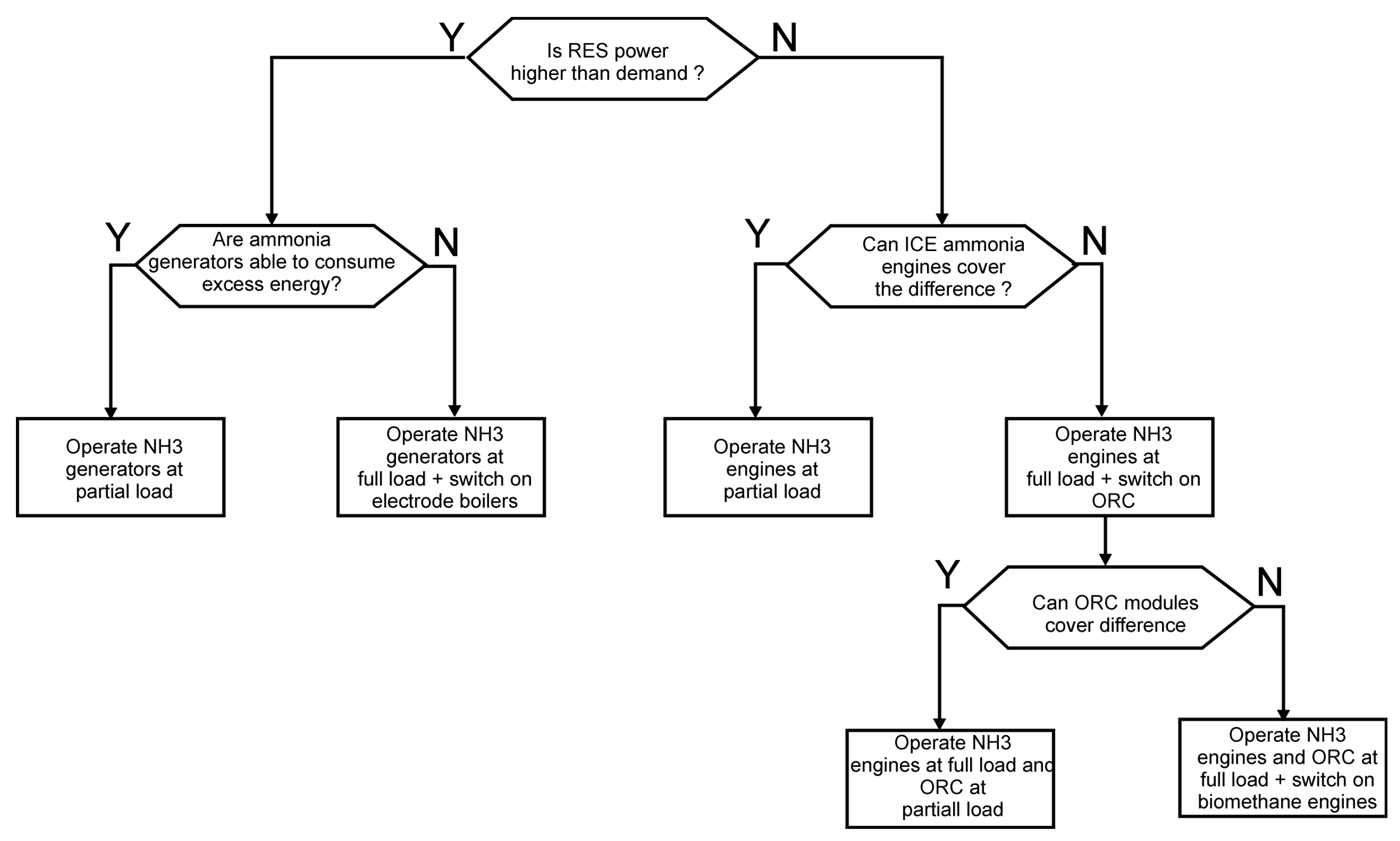 Figure 3 shows the concept of an energy system based solely on renewable sources. It consists of weather-dependent renewable sources: wind turbines (WTs) and a PV panel, biomethane tanks (BG stor), biomethane-fueled internal combustion engines (BG ICE), solid biomass storage facilities (SB stor), ORC systems powered by solid biomass (SB ORC), ammonia production systems powered by excess electricity generated from renewable sources (NH3 prod), ammonia tanks (NH3 stor), and ammonia-fueled internal combustion engines (NH3 ICE). When energy production from weather-dependent renewable sources do not cover the demand, the stored chemical energy from biomethane, solid biomass, and ammonia is utilized. When energy production from weather-dependent renewable sources exceeds demand, ammonia is produced and stored in pressurized steel tanks.