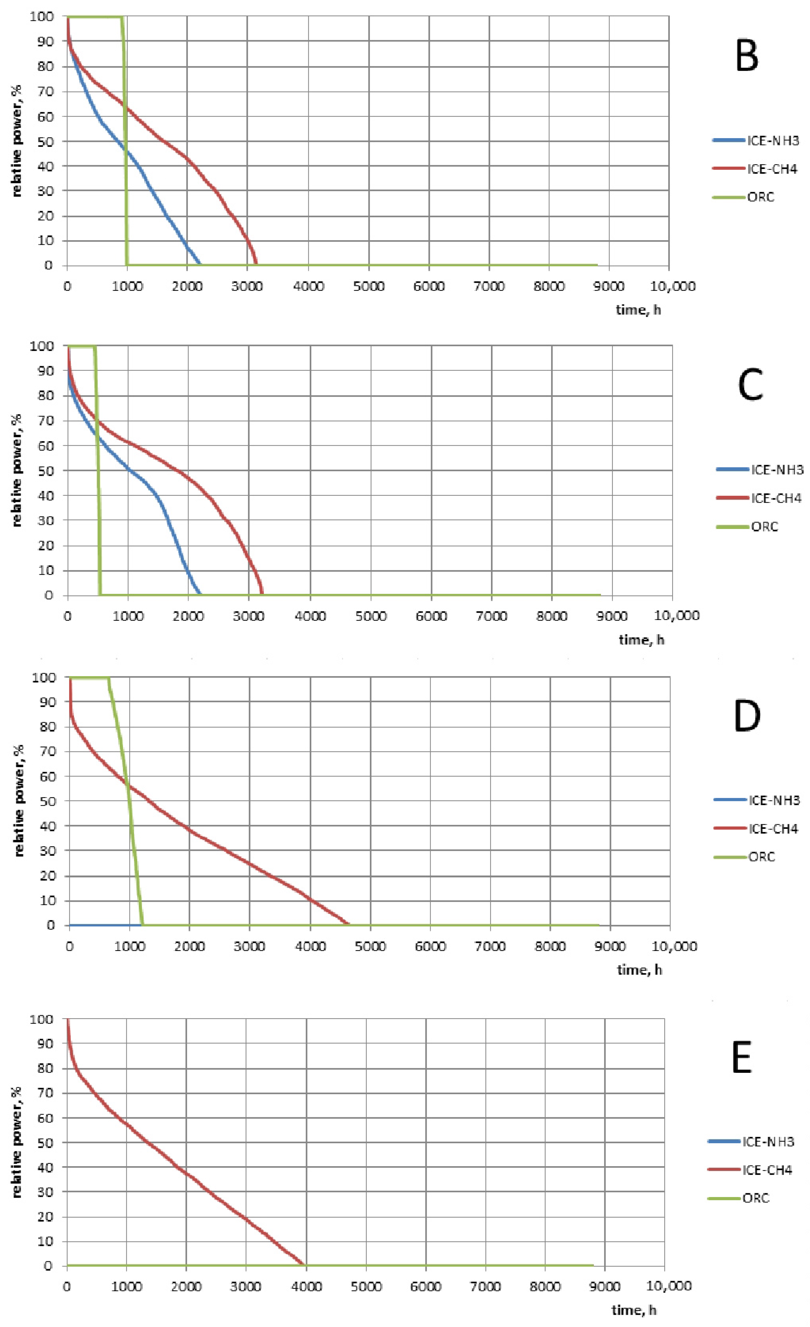 Figure 6 shows the duration curve of the installed equipment’s capacity utilization. As one can see, the equipment is used for a very limited time—for ORC modules, it is just over 1000 h per year; for ammonia-powered engines, about 1500 h; and for methane-powered engines, around 4000 h. The economic viability of operating these devices would require market solutions that would provide financing for the equipment to ensure their readiness for operation.