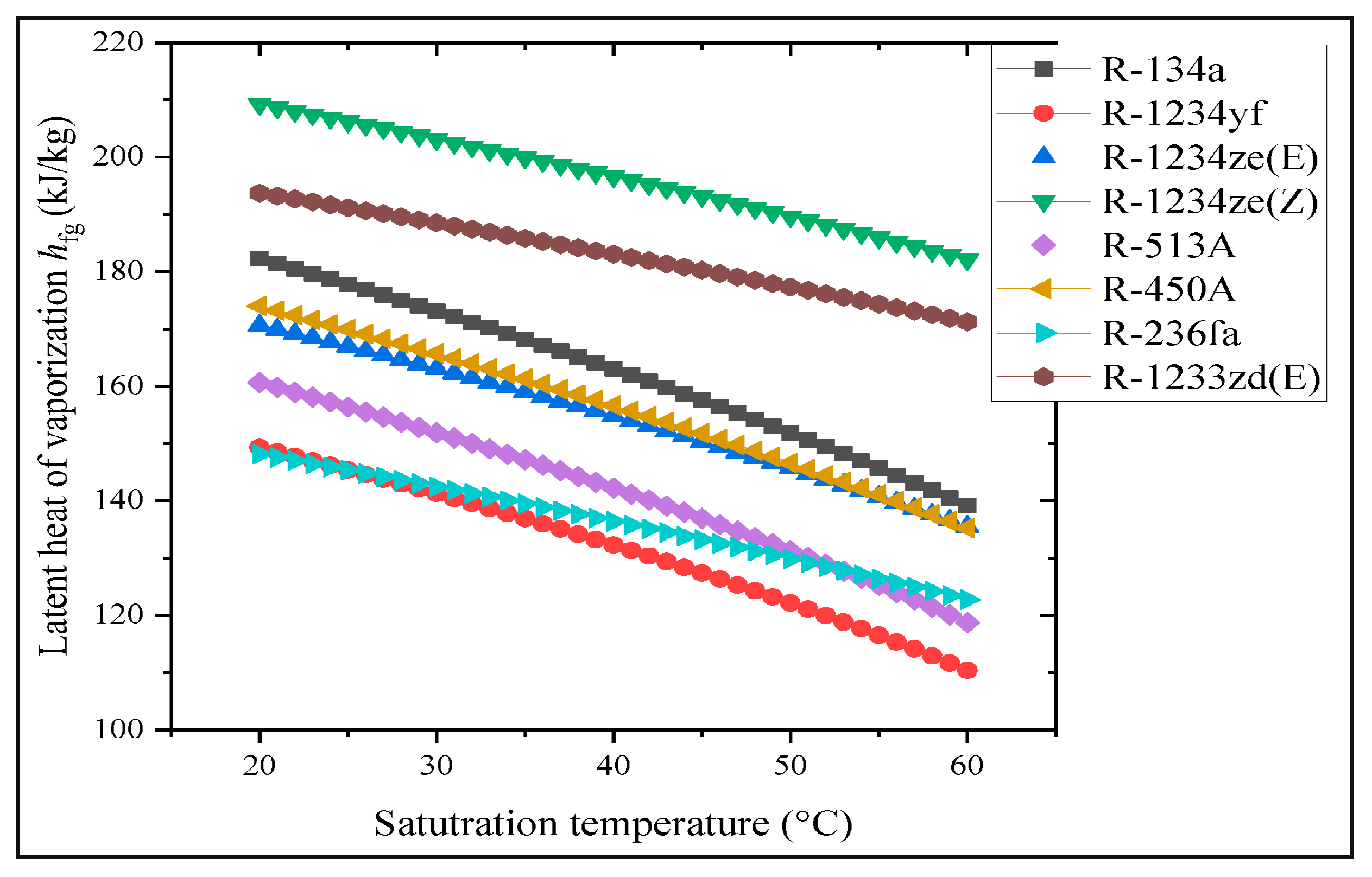 Several fluids demonstrate high efficiency, such as the widely used R134a, characterized by high performance. However, its high GWP leads to consideration of other fluids like R1233zd(E) and R1234ze(Z), noted for high latent heat. R450a is another refrigerant that follows these two in terms of latent heat, as demonstrated in