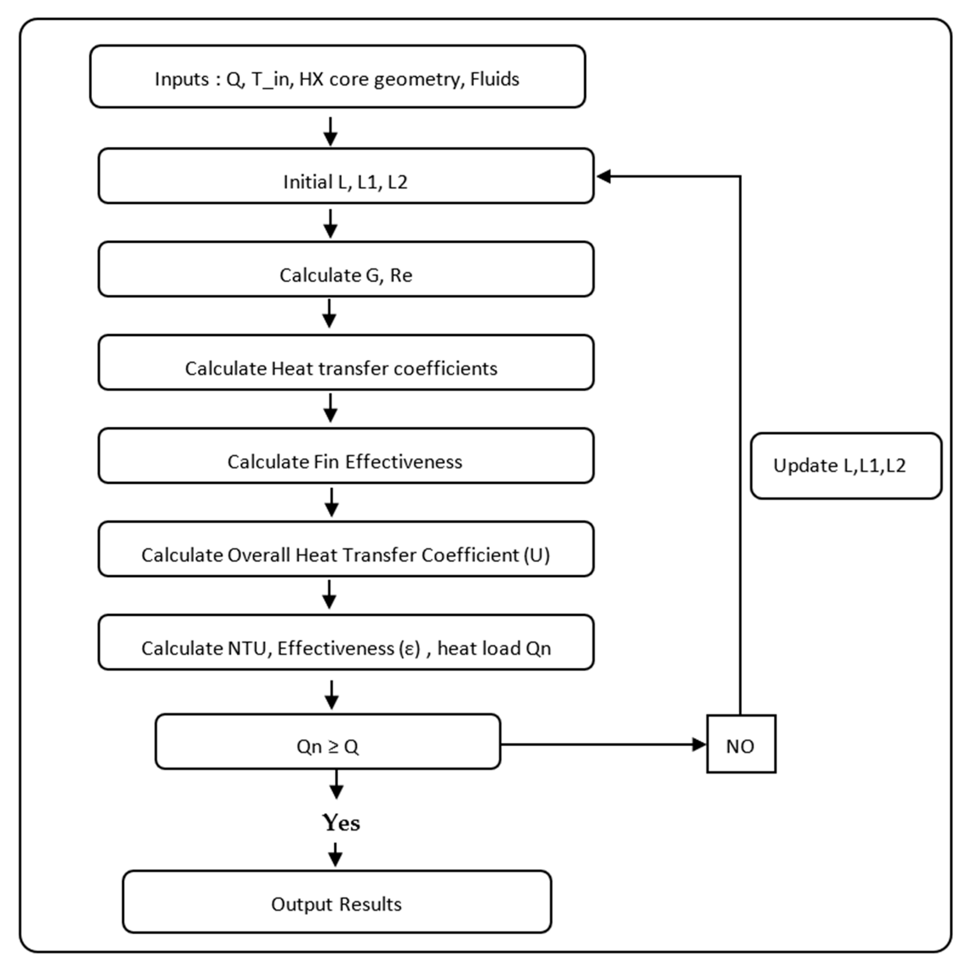 Based on the given inputs—such as refrigerant characteristics, environmental conditions, fluid input temperatures, and heat exchanger core geometry—the code performs an iterative calculation to define the required sizes. The algorithm begins with an assumed small geometry and grows the part in three dimensions using mathematical correlations and equations for condensation, boiling, and pressure drop until the required design conditions are met. The model also estimates the weight of these components.