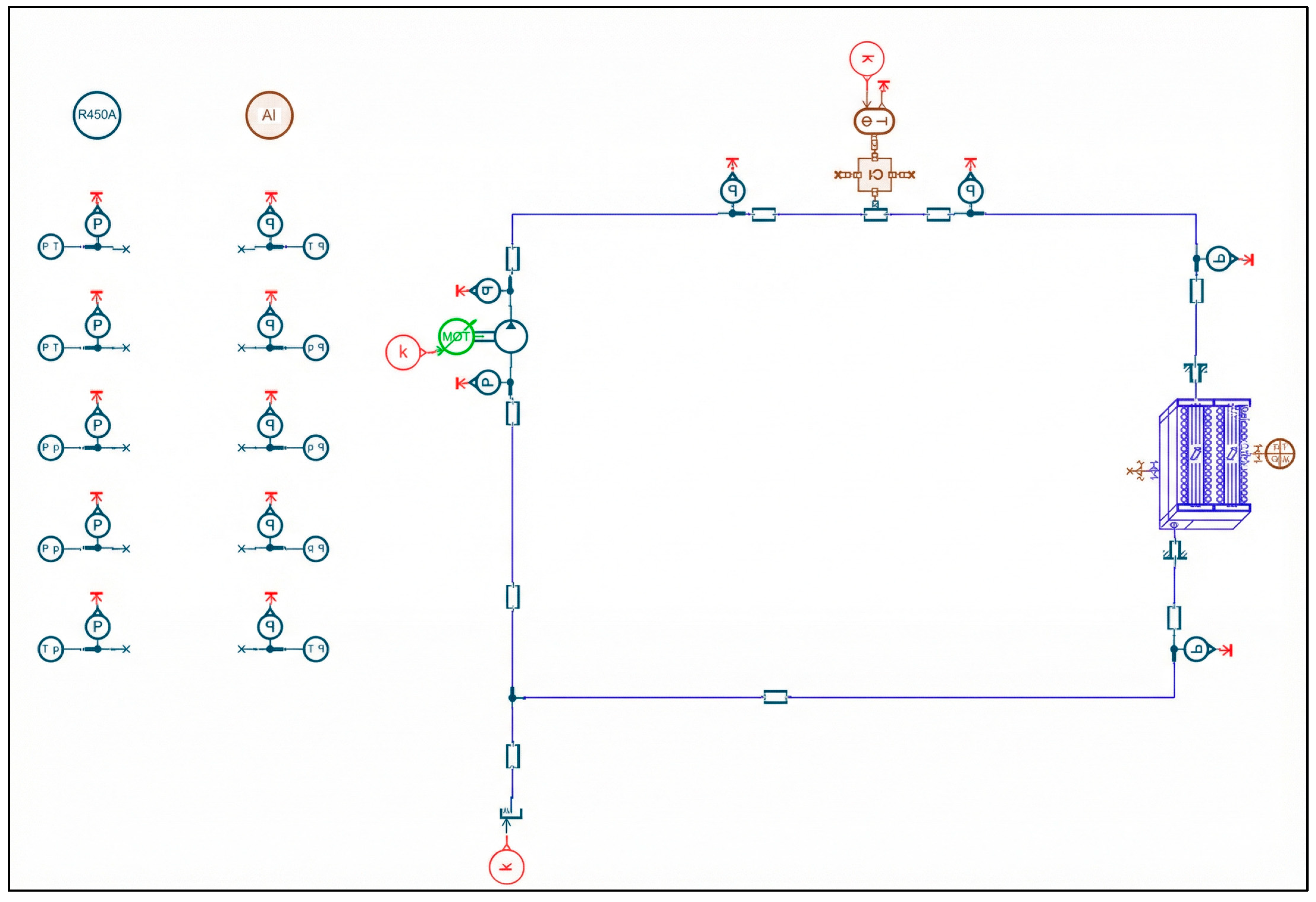 To prove the validity of the proposed model, a TMS able to maintain the 70 kW heat load released from the 1.4 MW battery that supplies power to the HEA below 40 °C was simulated and evaluated. The P2PL uses R450a refrigerant as the working fluid. The system’s functionality relies on the latent heat of the working fluid. The target fluid circulates in a cold plate, absorbing the heat load using latent heat and enabling efficient absorption. Meanwhile, the fluid shifts state from liquid to two-phase, continuing through the loop until it becomes condensate, at which point it is pumped again. In conventional cooling systems, heat is absorbed via specific heat, which is significantly lower than latent heat. For example, the specific heat of water used in air-cooled systems is 4.18 kJ/kg·K. However, the latent heat of the same fluid (water) is around 500 times greater, reaching approximately 2260 kJ/kg.