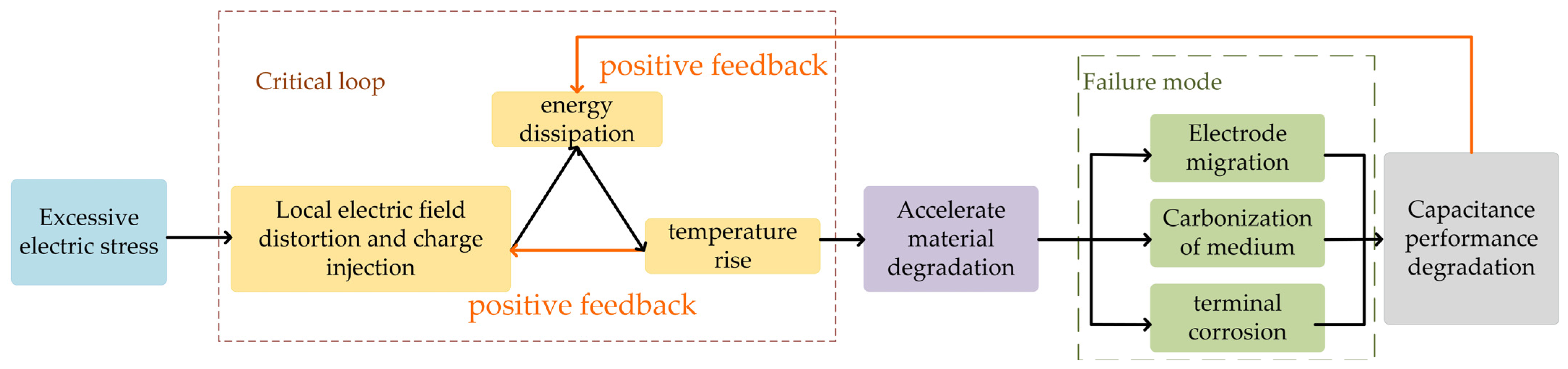 | Polymer film capacitors | Dielectric breakdown Thermal accumulation causes dielectric aging and breakdown | [36,37,38] |