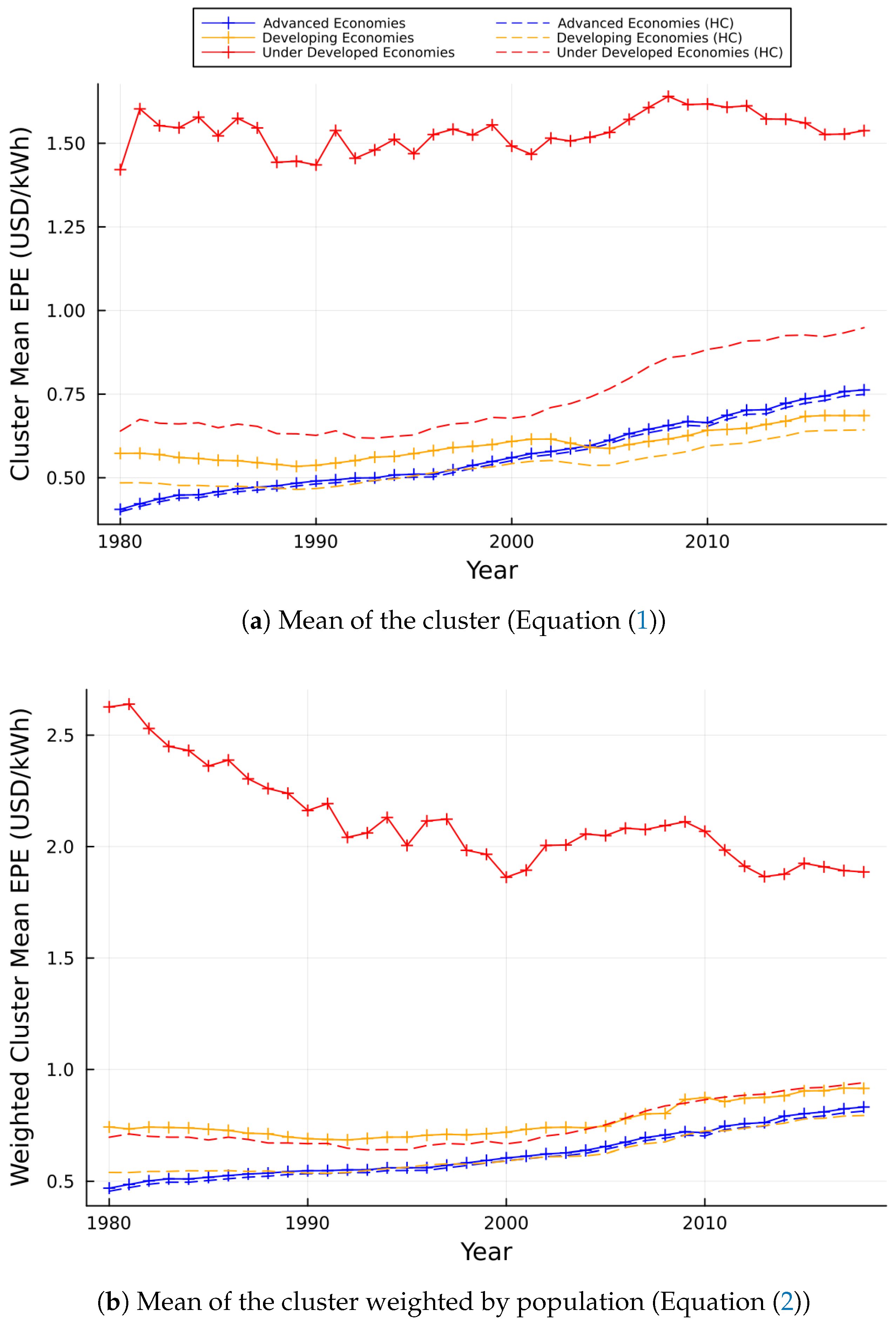 22], and this growth was driven by the improvement in the EPE of the advanced economies. Furthermore, we find that the underdeveloped economies have the highest values of EPE. The nearly constant trend of the mean EPE of the underdeveloped economies in