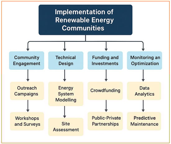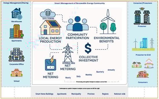 The subsequent works detail other countries’ initiatives, including Asian and EU countries. The authors in [37] examined India’s renewable energy ecosystem and focused on undiscovered possibilities, as well as the existing rules and incentive structures that support energy security and the growth of RECs. Their research provided a thorough summary of national policies and initiatives that support the combination of solar, wind, and bioenergy, illustrating how these initiatives are matched with India’s overall energy transformation objectives. They found that meeting the government’s 2030 objective of 500 GW is doable with supportive legislation and by resolving critical barriers. Moreover, the research in [38] proposed an optimal design for a public–private REC in a small Italian town while offering a governance and financial framework to promote balanced stakeholder involvement and effective integration of renewables at the community level.