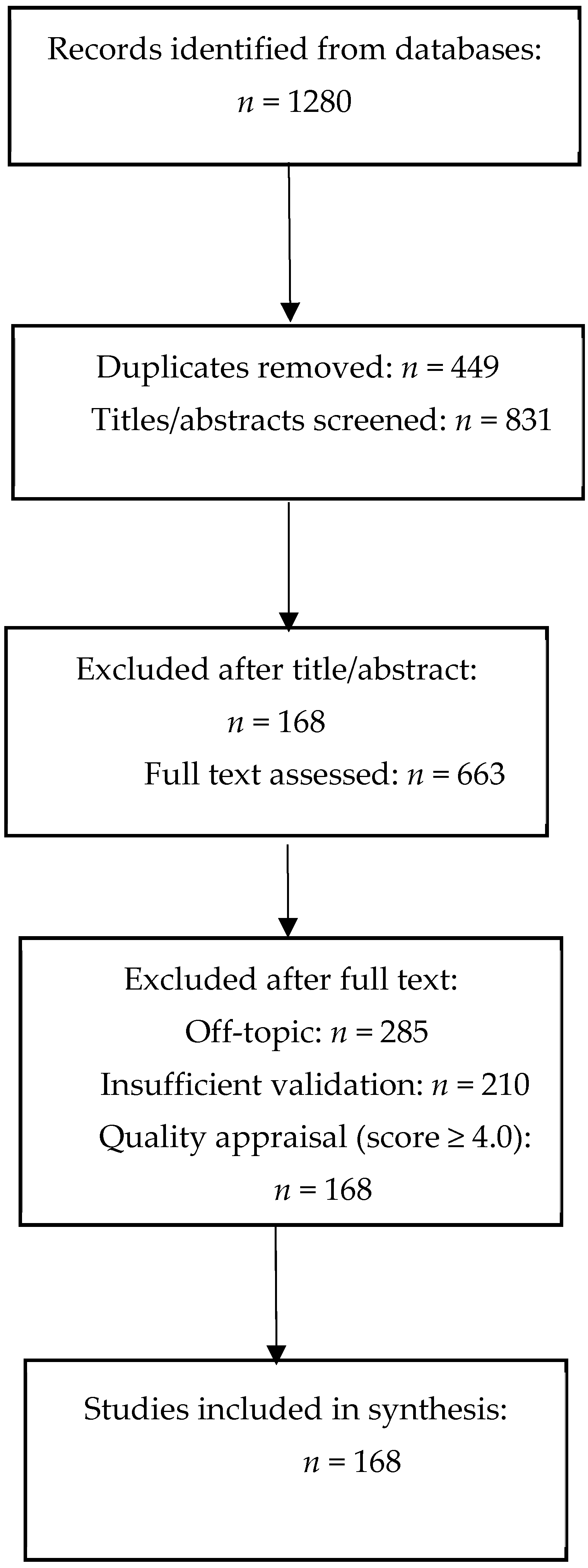 | Stage 1: Deduplication and language filtering | Removed duplicate entries and non-English publications | Automated filtering and manual verification | 831 |