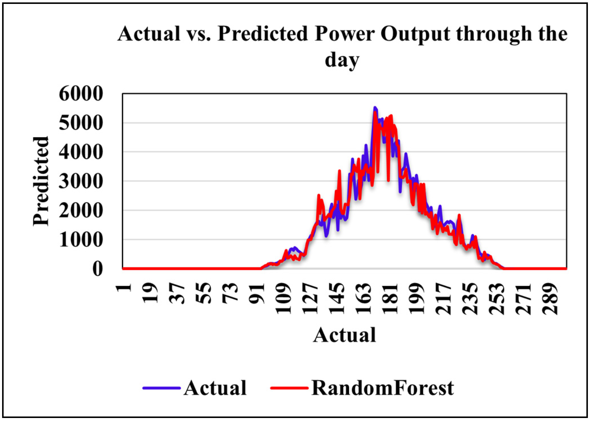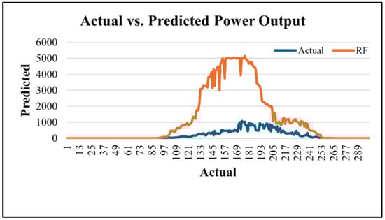 Figure 11 compares actual and Random Forest-predicted power output over a daily cycle. The model closely follows the observed trend, capturing the morning increase, midday peak, and evening decline, with only minor deviations.