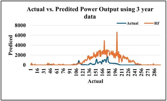 Figure 8 illustrates the comparison of actual Random Forest (RF) and predicted power output over three years. The RF model follows the general trend but overestimates values during peak generation, indicating the need for improved accuracy in capturing fluctuation.