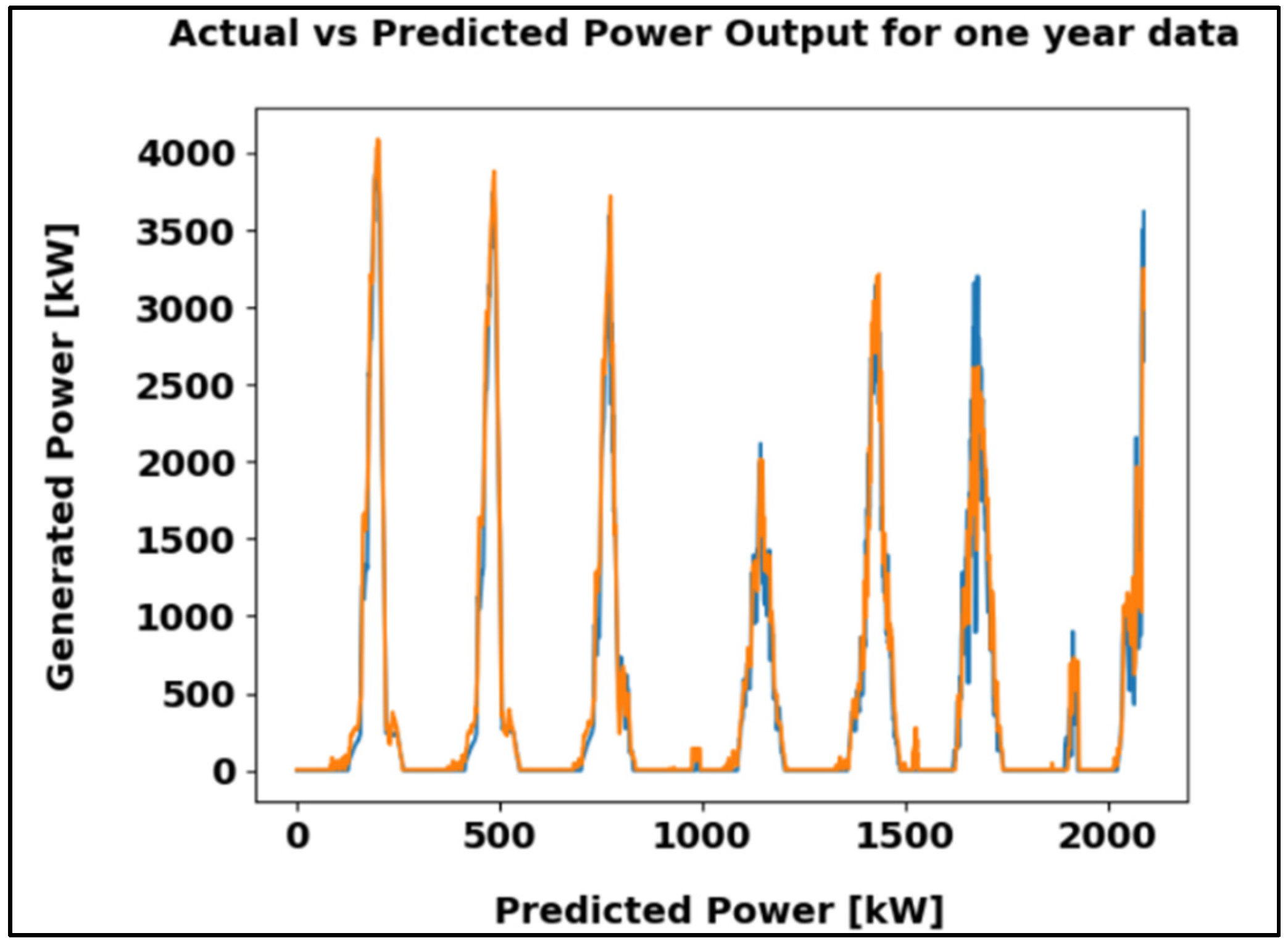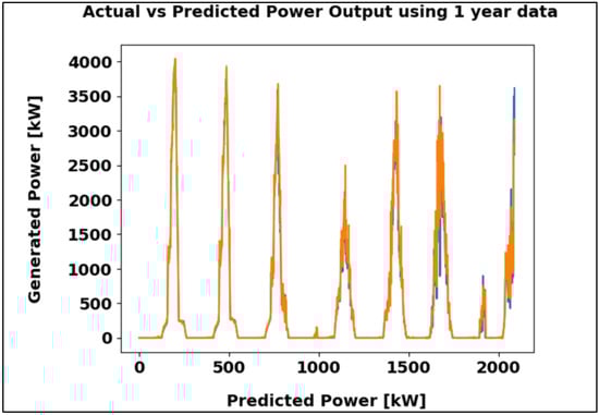 Figure 14 illustrates the comparison between actual and predicted power output for one year of data, revealing a strong correlation between the two. The MAE of 61.92 kW reflects precise estimation and consistent performance of the model.