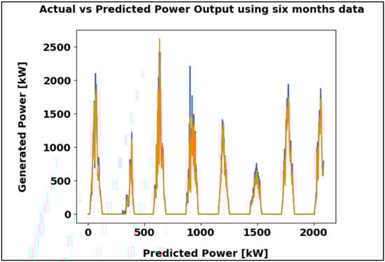 Figure 15 presents a comparison between actual and predicted power output over six months, showing a close match between both curves. The MAE of 48.98 kW indicates precise prediction and strong model reliability.