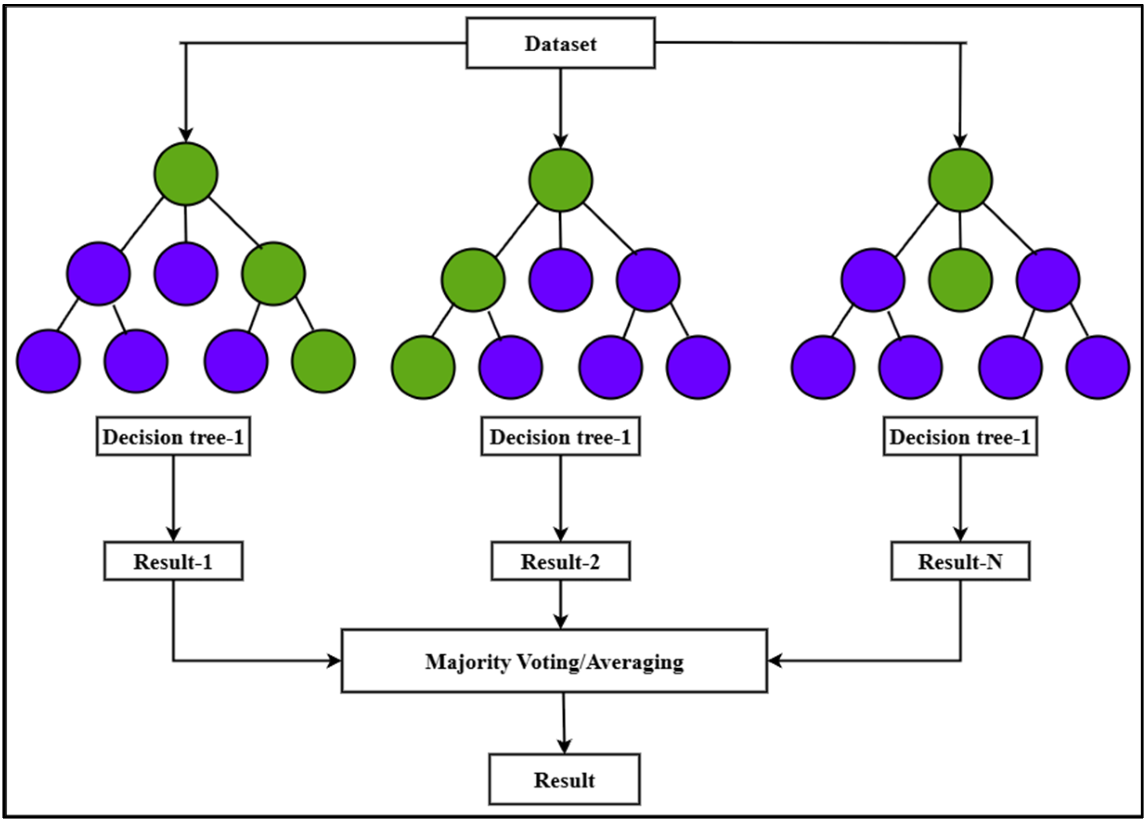 In classification, the final choice is decided by majority vote, whereas in regression, the final prediction is derived by averaging the outputs of all trees. The following is a mathematical representation of the total regression predictions: