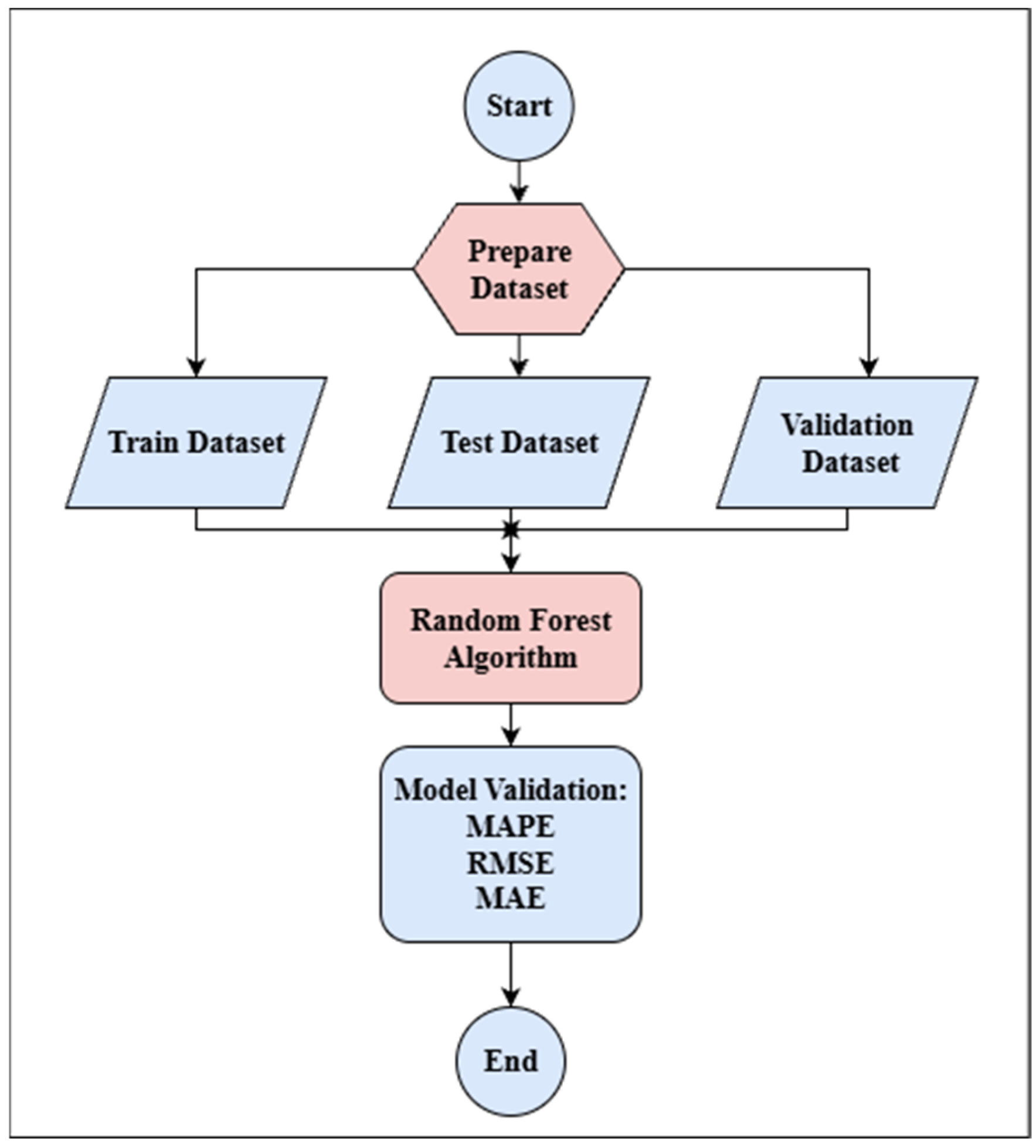This Random Forest flowchart of Figure 2 shows how to use the Random Forest algorithm for prediction problems in general. To ensure dependable model building, the procedure starts with data preparation, in which the dataset is gathered, arranged, and separated into training, testing, and validation subsets. In order to produce predictions, the model is subsequently tested on the remaining subsets after being trained on the training data. Lastly, assessment measures like MAPE, RMSE, and MAE are used to evaluate its accuracy and robustness, guaranteeing consistent performance across unknown data and real-world circumstances [14].