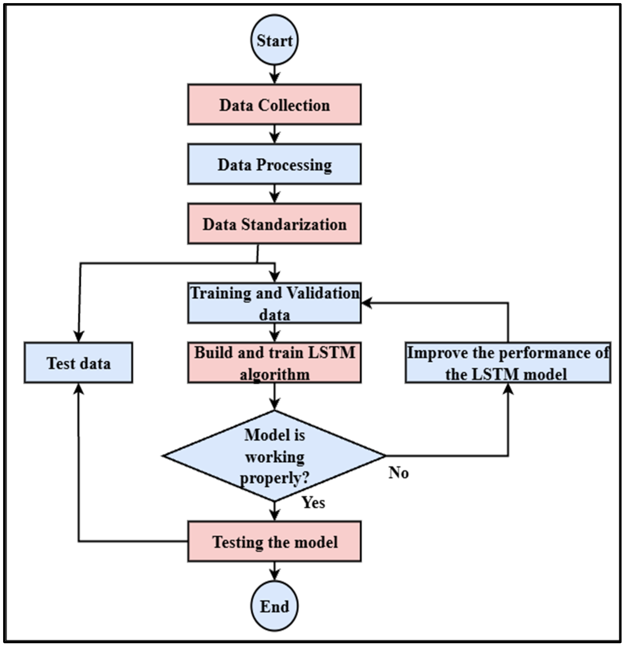 The Figure 4 is the process of creating and assessing an LSTM model is shown in this flowchart. Data gathering comes first, then processing and standards. After that, the data are divided into test and training/validation sets. Training data are used to construct and train the LSTM model. The model is further optimized if it performs poorly. The procedure ends when the model is tested using the test data, and satisfactory performance is attained [17].