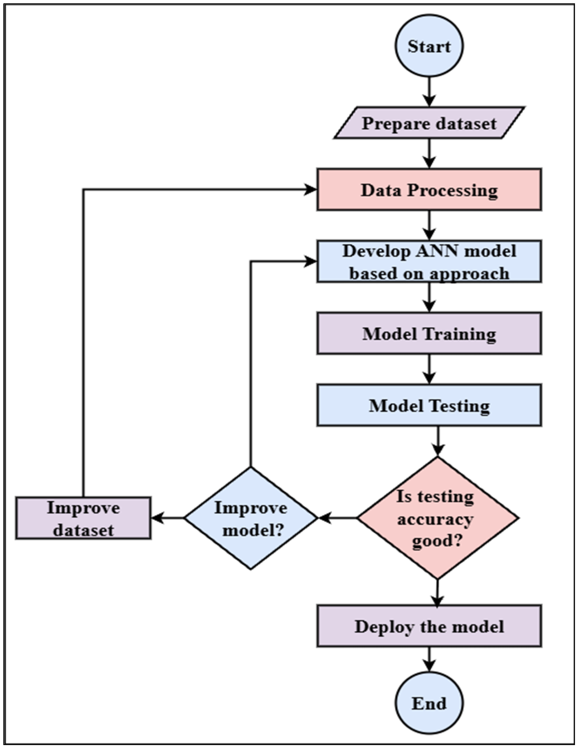 Figure 6 shows the flowchart of the Artificial Neural Network process, starting with loading and preprocessing the dataset, including tasks like cleaning and normalization. After that, an ANN model is developed based on a selected method suitable for the problem. After that, the model’s performance is assessed by testing and training. The model is put into use if the resting accuracy is acceptable. If not, the process checks whether to improve the model architecture or enhance the dataset. Depending on this decision, adjustments are made, and the model is retrained. This cycle continues until the desired accuracy is achieved, at which point the model is finalized and deployed [21].