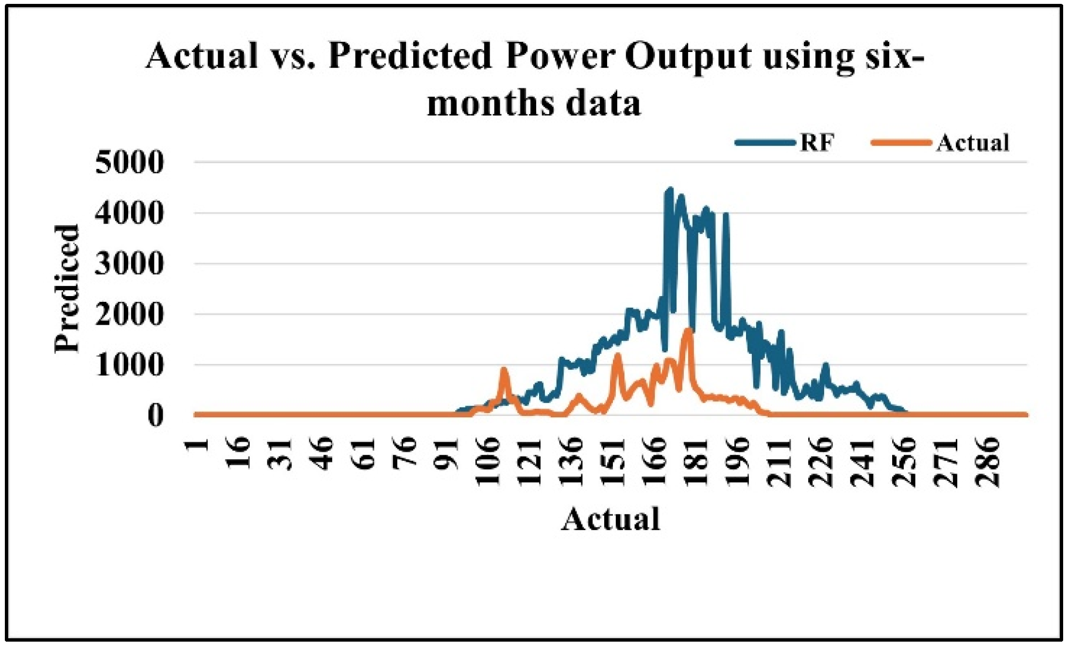 Figure 10 compares the Random Forest (RF) predictions with the actual power output across six months. While the model follows the general trend of the data, it tends to overestimate during high-output periods, leading to noticeable deviations at peak values.