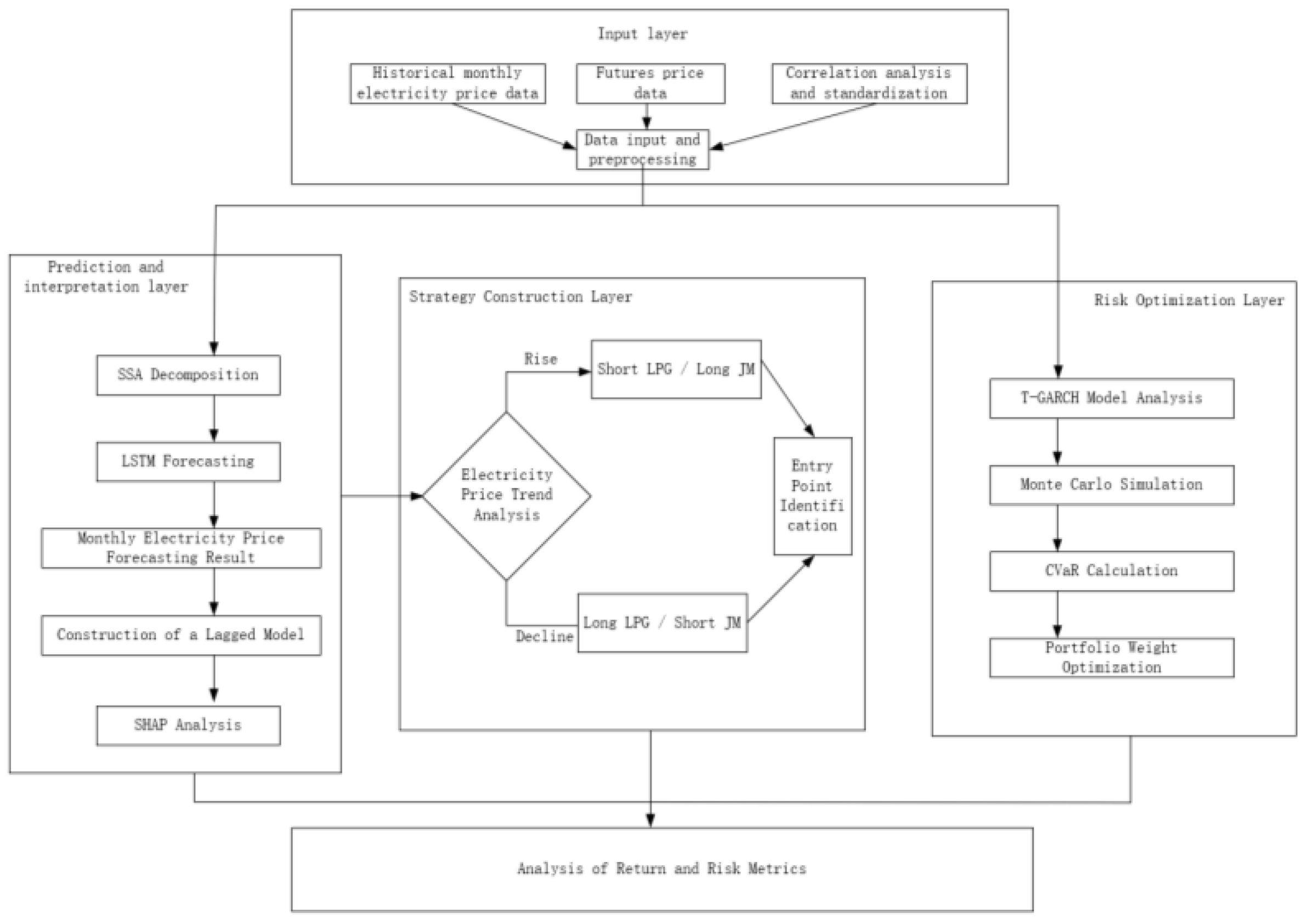 An Integrated Forecasting-Hedging Framework: By developing a hybrid SSA-LSTM model that incorporates energy futures prices, this study not only improves monthly electricity price forecast accuracy but also directly uses the forecasted trend to generate clear signals for futures market operations, creating a closed-loop from prediction to strategy execution.